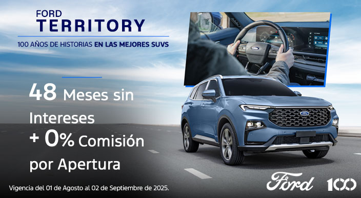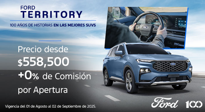 Territory 2025 Sujeto a análisis de crédito por parte de Ford Credit de México, S.A. de C.V., SOFOM, E.R. Plan de financiamiento 48/0% (CUARENTA Y OCHO MESES AL CERO POR CIENTO DE TASA DE INTERÉS ANUAL ORDINARIA FIJA) ó bono de $100,000.00 (CIEN MIL PESOS 00/100 M.N. IVA incluido), sin comisión por apertura de crédito aplica únicamente para Ford Territory 2025 catálogos Trend y Titanium. Vigencia del 01 de agosto al 02 de septiembre del 2025. Plan de financiamiento 48/0% (CUARENTA Y OCHO MESES AL CERO POR CIENTO DE TASA DE INTERÉS ANUAL ORDINARIA FIJA) aplica con financiamiento con Ford Credit ó bono de $100,000.00 (CIEN MIL PESOS 00/100 M.N. IVA incluido) todas las operaciones, aplicable al precio total del vehículo, enganche, seguro, accesorios o extensión de garantía. La diferencia en el costo del seguro deberá ser cubierta por el cliente. El bono puede ser aplicado en cualquiera de los conceptos mencionados en el porcentaje que el cliente decida. El bono debe aplicarse en una sola exhibición, no se puede sustituir por otro producto o servicio, o por una bonificación en efectivo. Aplica únicamente para Ford Territory 2025 catálogos Trend (TR225) y Titanium (TR125). Sujeto a disponibilidad. No aplica para flotillas. Vigencia del 01 de agosto al 02 de septiembre del 2025. Plan de financiamiento 48/0% (CUARENTA Y OCHO MESES AL CERO POR CIENTO DE TASA DE INTERÉS ANUAL ORDINARIA FIJA) aplica con un precio desde $773,500.00 (SETECIENTOS SETENTA Y TRES MIL QUINIENTOS PESOS 00/100 M.N.) para catálogo Ford Territory Titanium 2025. CAT PROMEDIO 9.77% (NUEVE PUNTO SETENTA Y SIETE POR CIENTO) sin IVA para fines informativos y de comparación calculado al 24/07/2025 con una tasa de interés anual ordinaria fija del 0% (CERO POR CIENTO) sobre un plazo de 48 (CUARENTA Y OCHO) meses, aplica con un enganche mínimo del 37% (TREINTA Y SIETE CIENTO). Aplica con prima de seguro de daños y vida de contado por todo el plazo. Aplica sin comisión por apertura de crédito. Los intereses se generarán a partir de la firma del contrato respectivo de financiamiento con Ford Credit de México, S.A. de C.V., SOFOM, E.R. Sujeto a disponibilidad de crédito. No aplica para flotillas. Consulta términos y condiciones en tu Distribuidor autorizado Ford más cercano. Ford Motor Company, S.A. de C.V., todos los derechos reservados. Imágenes meramente ilustrativas. Vigencia del 01 de agosto al 02 de septiembre del 2025. Precio desde $558,500.00 (QUINIENTOS CINCUENTA Y OCHO MIL QUINIENTOS PESOS 00/100 M.N. IVA INCLUIDO) sin comisión por apertura de crédito aplica únicamente para Ford Territory 2025 catálogo Trend. Vigencia del 01 de agosto al 02 de septiembre del 2025. Precio desde $558,500.00 (QUINIENTOS CINCUENTA Y OCHO MIL QUINIENTOS PESOS 00/100 M.N. IVA INCLUIDO) para Ford Territory 2025 catálogo Trend. Plan de financiamiento 24/16.20% (VEINTICUATRO MESES AL DIECISEIS PUNTO VEINTE POR CIENTO DE TASA DE INTÉRES ANUAL ORDINARIA FIJA). CAT 27% (VEINTISIETE POR CIENTO) calculado al 24/07/2025 con una tasa de interés anual ordinaria fija del 16.20% (DIECISEIS PUNTO VEINTE POR CIENTO) sobre un plazo de 24 (VEINTICUATRO) meses, aplica con un enganche mínimo del 10% (DIEZ POR CIENTO). Aplica con prima de seguro de daños y vida de contado por todo el plazo. Aplica sin comisión por apertura de crédito. Los intereses se generarán a partir de la firma del contrato respectivo de financiamiento con Ford Credit de México, S.A. de C.V., SOFOM, E.R. Sujeto a disponibilidad de crédito. No aplica para flotillas. Consulta términos y condiciones en tu Distribuidor autorizado Ford más cercano. Ford Motor Company, S.A. de C.V., todos los derechos reservados. Imágenes meramente ilustrativas. Vigencia del 01 de agosto al 02 de septiembre del 2025. Seguro para Ford Territory 2025 con precio preferencial único para el primer año de $10,000 (DIEZ MIL PESOS 00/100 M.N. IVA INCLUIDO) PRIMA TOTAL. Aplica con la contratación y pagos anuales de la póliza Ford Insure en operaciones de crédit