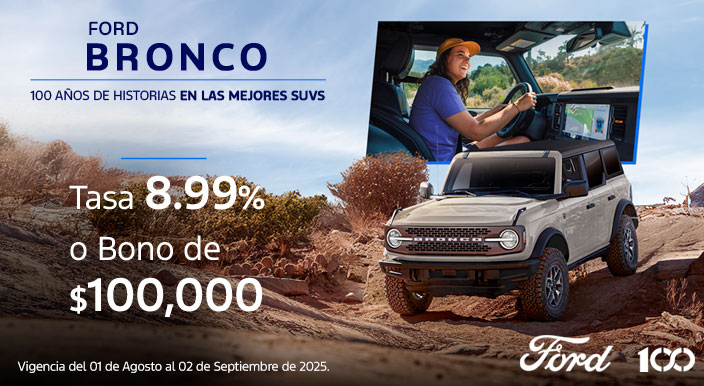 Bronco 2025 Sujeto a análisis de crédito por parte de Ford Credit de México, S.A. de C.V., SOFOM, E.R. Plan de financiamiento 24/8.99% (VEINTICUATRO MESES AL OCHO PUNTO NOVENTA Y NUEVE POR CIENTO DE TASA DE INTERÉS ANUAL ORDINARIA FIJA) aplica con financiamiento con Ford Credit ó bono de $100,000 (CIEN MIL PESOS 00/100 M.N. IVA incluido) todas las operaciones, aplicable al precio total del vehículo, enganche, seguro, accesorios o extensión de garantía. Aplica para Ford Bronco 2025 todos los catálogos. La diferencia en el costo del seguro deberá ser cubierta por el cliente. El bono puede ser aplicado en cualquiera de los conceptos mencionados en el porcentaje que el cliente decida. El bono debe aplicarse en una sola exhibición, no se puede sustituir por otro producto o servicio, o por una bonificación en efectivo. Sujeto a disponibilidad. No aplica para flotillas. Plan de financiamiento 24/8.99% (VEINTICUATRO MESES AL OCHO PUNTO NOVENTA Y NUEVE POR CIENTO DE TASA DE INTERÉS ANUAL ORDINARIA FIJA) aplica con un precio de $1,569,900.00 (UN MILLÓN QUINIENTOS SESENTA Y NUEVE MIL NOVECIENTOS PESOS 00/100 M.N.) para catálogo Ford Bronco 2025 catálogo Badlands 4 puertas. CAT PROMEDIO 27% (VEINTISIETE POR CIENTO) sin IVA para fines informativos y de comparación calculado al 24/07/2025 con una tasa de interés anual ordinaria fija del 8.99% (OCHO PUNTO NOVENTA Y NUEVE POR CIENTO) sobre un plazo de 24 (VEINTICUATRO) meses, aplica con un enganche mínimo del 40% (CUARENTA POR CIENTO). Aplica con prima de seguro de daños y vida de contado por todo el plazo. Aplica comisión por apertura de crédito. Los intereses se generarán a partir de la firma del contrato respectivo de financiamiento con Ford Credit de México, S.A. de C.V., SOFOM, E.R. Sujeto a disponibilidad de crédito. No aplica para flotillas. Consulta términos y condiciones en tu Distribuidor autorizado Ford más cercano. Ford Motor Company, S.A. de C.V., todos los derechos reservados. Imágenes meramente ilustrativas. Vigencia del 01 de agosto al 02 de septiembre del 2025. Seguro para Ford Bronco 2025 con precio preferencial único para el primer año de $38,800 (TREINTA Y OCHO MIL OCHOCIENTOS PESOS 00/100 M.N. IVA INCLUIDO) PRIMA TOTAL. Aplica con la contratación y pagos anuales de la póliza Ford Insure en operaciones de crédito. El seguro tendrá una prima total sin costo para el primer año o primer recibo de 12 (DOCE) meses y los recibos subsecuentes se emitirán por el precio regular. No aplica para Ford Bronco 2025 catálogo Raptor. Ford Insure es un programa de seguros en conjunto con Zurich Compañía de Seguro, S.A. Sujeto a disponibilidad. Vigencia del 01 de agosto al 02 de septiembre del 2025.