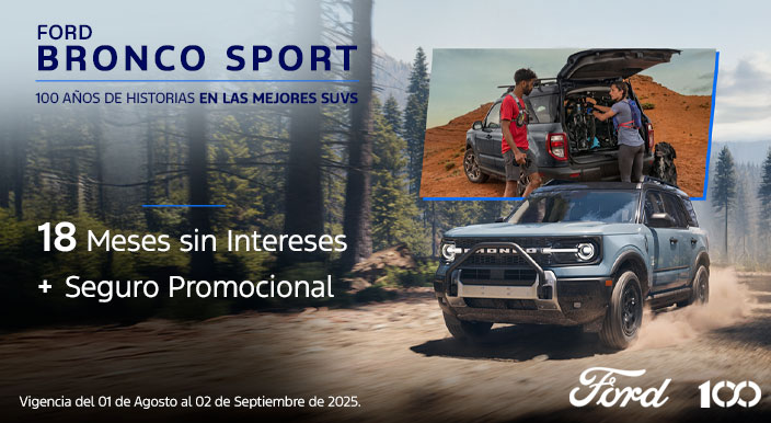 Bronco Sport 2025 Sujeto a análisis de crédito por parte de Ford Credit de México, S.A. de C.V., SOFOM, E.R. Plan de financiamiento 18/0% (DIECIOCHO MESES AL CERO POR CIENTO DE TASA DE INTERÉS ANUAL ORDINARIA FIJA) aplica con financiamiento con Ford Credit ó bono de $70,000 (SETENTA MIL PESOS 00/100 M.N. IVA incluido) todas las operaciones con tasa estándar, aplicable al precio total del vehículo, enganche, seguro, accesorios o extensión de garantía. La diferencia en el costo del seguro deberá ser cubierta por el cliente. El bono puede ser aplicado en cualquiera de los conceptos mencionados en el porcentaje que el cliente decida. El bono debe aplicarse en una sola exhibición, no se puede sustituir por otro producto o servicio, o por una bonificación en efectivo. Sujeto a disponibilidad. No aplica para flotillas. Plan de financiamiento 18/0% (DIECIOCHO MESES AL CERO POR CIENTO DE TASA DE INTERÉS ANUAL ORDINARIA FIJA) aplica con un precio desde $927,100.00 (NOVECIENTOS VEINTISIETE MIL CIEN PESOS 00/100 M.N.) para Ford Bronco Sport 2025 catálogo Badlands. CAT PROMEDIO 16.26% (DIECISEIS PUNTO VEINTISEIS POR CIENTO) sin IVA para fines informativos y de comparación calculado al 24/07/2025 con una tasa de interés anual ordinario fija del 0% (CERO POR CIENTO) sobre un plazo de 18 (DIECIOCHO) meses, aplica con un enganche mínimo del 40% (CUARENTA POR CIENTO), aplica con prima de seguro de daños y vida de contado por todo el plazo. Aplica comisión por apertura de crédito. Los intereses se generarán a partir de la firma del contrato respectivo de financiamiento con Ford Credit de México, S.A. de C.V., SOFOM, E.R. Sujeto a disponibilidad. No aplica para flotillas. Consulta términos y condiciones en tu Distribuidor autorizado Ford más cercano. Ford Motor Company, S.A. de C.V., todos los derechos reservados. Imágenes meramente ilustrativas. Vigencia del 01 de agosto al 02 de septiembre del 2025. Seguro para Ford Bronco Sport 2025 con precio preferencial único para el primer año de $22,100 (VEINTIDOS MIL CIEN PESOS 00/100 M.N. IVA INCLUIDO) PRIMA TOTAL. Aplica con la contratación y pagos anuales de la póliza Ford Insure en operaciones de crédito. El seguro tendrá una prima total sin costo para el primer año o primer recibo de 12 (DOCE) meses y los recibos subsecuentes se emitirán por el precio regular. Ford Insure es un programa de seguros en conjunto con Zurich Compañía de Seguro, S.A. Sujeto a disponibilidad. Vigencia del 01 de agosto al 02 de septiembre del 2025.