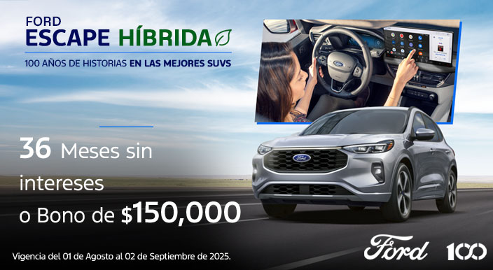 Escape 2025 Sujeto a análisis de crédito por parte de Ford Credit de México, S.A. de C.V., SOFOM, E.R. Plan de financiamiento 36/0% (TREINTA Y SEIS MESES AL CERO POR CIENTO DE TASA DE INTERÉS ANUAL ORDINARIA FIJA) aplica con financiamiento con Ford Credit ó bono de $150,000 (CIENTO CINCUENTA MIL PESOS 00/100 M.N. IVA incluido) en operaciones financiadas con tasa estándar, aplicable al precio total del vehículo, enganche, seguro, accesorios o extensión de garantía. La diferencia en el costo del seguro deberá ser cubierta por el cliente. El bono puede ser aplicado en cualquiera de los conceptos mencionados en el porcentaje que el cliente decida. El bono debe aplicarse en una sola exhibición, no se puede sustituir por otro producto o servicio, o por una bonificación en efectivo. Sujeto a disponibilidad. No aplica para flotillas. Plan de financiamiento 36/0% (TREINTA Y SEIS MESES AL CERO POR CIENTO DE TASA DE INTERÉS ANUAL ORDINARIA FIJA) aplica con un precio desde $881,100.00 (OCHOCIENTOS OCHENTA Y UN MIL CIEN PESOS 00/100 M.N.) para catálogo Ford Escape ST Line Select 2025. CAT PROMEDIO 13.02% (TRECE PUNTO CERO DOS POR CIENTO) sin IVA para fines informativos y de comparación calculado al 24/07/2025 con una tasa de interés anual ordinario fija del 0% (CERO POR CIENTO) sobre un plazo de 36 (TREINTA Y SEIS) meses, aplica con un enganche mínimo del 40% (CUARENTA POR CIENTO), aplica con prima de seguro de daños y vida de contado por todo el plazo. Aplica comisión por apertura de crédito. Los intereses se generarán a partir de la firma del contrato respectivo de financiamiento con Ford Credit de México, S.A. de C.V., SOFOM, E.R. Sujeto a disponibilidad. No aplica para flotillas. Consulta términos y condiciones en tu Distribuidor autorizado Ford más cercano. Ford Motor Company, S.A. de C.V., todos los derechos reservados. Imágenes meramente ilustrativas. Vigencia del 01 de agosto al 02 de septiembre del 2025. Seguro para Ford Escape 2025 con precio preferencial único para el primer año de $18,500 (DIECIOCHO MIL QUINIENTOS PESOS 00/100 M.N. IVA INCLUIDO) PRIMA TOTAL. Aplica con la contratación y pagos anuales de la póliza Ford Insure en operaciones de crédito. El seguro tendrá una prima total sin costo para el primer año o primer recibo de 12 (DOCE) meses y los recibos subsecuentes se emitirán por el precio regular. Ford Insure es un programa de seguros en conjunto con Zurich Compañía de Seguro, S.A. Sujeto a disponibilidad. Vigencia del 01 de agosto al 02 de septiembre del 2025.