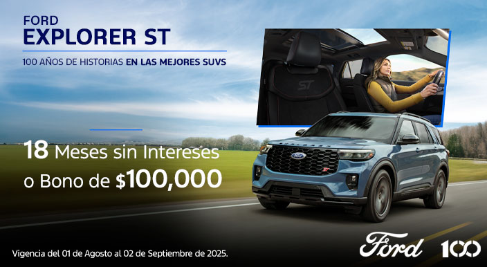 Explorer ST 2025 Sujeto a análisis de crédito por parte de Ford Credit de México, S.A. de C.V., SOFOM, E.R. Plan de financiamiento 18/0% (DIECIOCHO MESES AL CERO POR CIENTO DE TASA DE INTERÉS ANUAL ORDINARIA FIJA) aplica con financiamiento con Ford Credit ó bono de $100,000 (CIEN MIL PESOS 00/100 M.N. IVA incluido) en operaciones financiadas con tasa estándar, aplicable al precio total del vehículo, enganche, seguro, accesorios o extensión de garantía. La diferencia en el costo del seguro deberá ser cubierta por el cliente. El bono puede ser aplicado en cualquiera de los conceptos mencionados en el porcentaje que el cliente decida. El bono debe aplicarse en una sola exhibición, no se puede sustituir por otro producto o servicio, o por una bonificación en efectivo. Sujeto a disponibilidad. No aplica para flotillas. Plan de financiamiento 18/0% (DIECIOCHO MESES AL CERO POR CIENTO DE TASA DE INTERÉS ANUAL ORDINARIA FIJA) aplica con un precio desde $1,469,100.00 (UN MILLON CUATROCIENTOS SESENTA Y NUEVE MIL CIEN PESOS 00/100 M.N.) para Ford Explorer 2025 catálogo ST. CAT PROMEDIO 12.65% (DOCE PUNTO SESENTA Y CINCO POR CIENTO) sin IVA para fines informativos y de comparación calculado al 30/07/2025 con una tasa de interés anual ordinario fija del 0% (CERO POR CIENTO) sobre un plazo de 18 (DIECIOCHO) meses, aplica con un enganche mínimo del 40.39% (CUARENTA PUNTO TREINTA Y NUEVE POR CIENTO), aplica con prima de seguro de daños y vida de contado por todo el plazo. Aplica comisión por apertura de crédito. Los intereses se generarán a partir de la firma del contrato respectivo de financiamiento con Ford Credit de México, S.A. de C.V., SOFOM, E.R. Sujeto a disponibilidad. No aplica para flotillas. Consulta términos y condiciones en tu Distribuidor autorizado Ford más cercano. Ford Motor Company, S.A. de C.V., todos los derechos reservados. Imágenes meramente ilustrativas. Vigencia del 01 de agosto al 02 de septiembre del 2025. Seguro para Ford Explorer 2025 con precio preferencial único para el primer año de $24,800 (VEINTICUATRO MIL OCHOCIENTOS PESOS 00/100 M.N. IVA INCLUIDO) PRIMA TOTAL. Aplica con la contratación y pagos anuales de la póliza Ford Insure en operaciones de crédito. El seguro tendrá una prima total sin costo para el primer año o primer recibo de 12 (DOCE) meses y los recibos subsecuentes se emitirán por el precio regular. Ford Insure es un programa de seguros en conjunto con Zurich Compañía de Seguro, S.A. Sujeto a disponibilidad. Vigencia del 01 de agosto al 02 de septiembre del 2025.