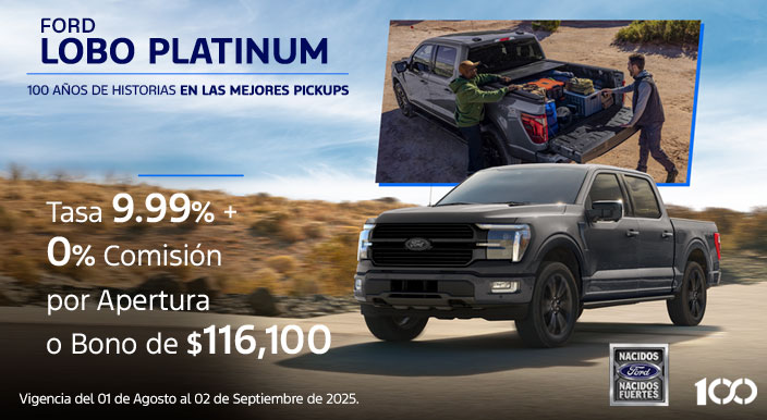 Lobo Platinum 2025 Sujeto a análisis de crédito por parte de Ford Credit de México, S.A. de C.V., SOFOM, E.R. Plan de financiamiento 24/9.99% (VEINTICUATRO MESES AL NUEVE PUNTO NOVENTA Y NUEVE POR CIENTO DE TASA DE INTERÉS ANUAL ORDINARIA FIJA) aplica con financiamiento con Ford Credit ó bono de $116,100.00 (CIENTO DIECISEIS MIL CIEN PESOS 00/100 M.N. IVA incluido) en operaciones financiadas con tasa estándar, aplicable al precio total del vehículo, enganche, seguro, accesorios o extensión de garantía. Aplica únicamente para Ford Lobo Platinum 2025. La diferencia en el costo del seguro deberá ser cubierta por el cliente. El bono puede ser aplicado en cualquiera de los conceptos mencionados en el porcentaje que el cliente decida. El bono debe aplicarse en una sola exhibición, no se puede sustituir por otro producto o servicio, o por una bonificación en efectivo. Sujeto a disponibilidad. No aplica para flotillas. Plan de financiamiento 24/9.99% (VEINTICUATRO MESES AL MESES PUNTO NOVENTA Y NUEVE POR CIENTO DE TASA DE INTERÉS ANUAL ORDINARIA FIJA) aplica con un precio de $1,615,100.00 (UN MILLÓN SEISCIENTOS QUINCE MIL CIEN PESOS 00/100 M.N.) para catálogo Ford Lobo Platinum 2025. CAT PROMEDIO 29.8% (VEINTINUEVE PUNTO OCHO POR CIENTO) sin IVA para fines informativos y de comparación calculado al 31/07/2025 con una tasa de interés anual ordinaria fija del 9.99% (NUEVE PUNTO NOVENTA Y NUEVE POR CIENTO) sobre un plazo de 24 (VEINTICUATRO) meses, aplica con un enganche mínimo del 40% (CUARENTA POR CIENTO). Aplica con prima de seguro de daños y vida de contado por todo el plazo. Aplica sin comisión por apertura de crédito para Ford Lobo 2025 catálogo Platinum. Los intereses se generarán a partir de la firma del contrato respectivo de financiamiento con Ford Credit de México, S.A. de C.V., SOFOM, E.R. Sujeto a disponibilidad de crédito. No aplica para flotillas. Consulta términos y condiciones en tu Distribuidor autorizado Ford más cercano. Ford Motor Company, S.A. de C.V., todos los derechos reservados. Imágenes meramente ilustrativas. Vigencia del 01 de agosto al 02 de septiembre de 2025. Seguro para Ford Lobo 2025 con precio preferencial único para el primer año de $57,000.00 (CINCUENTA Y SIETE MIL PESOS 00/100 M.N. IVA INCLUIDO) PRIMA TOTAL. Aplica con la contratación y pagos anuales de la póliza Ford Insure en operaciones de crédito. El seguro tendrá una prima total sin costo para el primer año o primer recibo de 12 (DOCE) meses y los recibos subsecuentes se emitirán por el precio regular. No aplica para Ford Lobo 2025 catálogo Raptor. Ford Insure es un programa de seguros en conjunto con Zurich Compañía de Seguro, S.A. Sujeto a disponibilidad. Vigencia del 01 de agosto al 02 de septiembre de 2025.