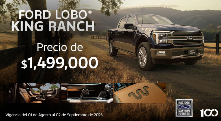 Lobo King Ranch 2025 Sujeto a análisis de crédito por parte de Ford Credit de México, S.A. de C.V., SOFOM, E.R. Precio de $1,499,000.00 (UN MILLÓN CUATROCIENTOS NOVENTA Y NUEVE MIL PESOS 00/100 M.N. IVA INCLUIDO) para Ford Lobo 2025 catálogo King Ranch. Plan de financiamiento 24/16.20% (VEINTICUATRO MESES AL DIECISÉIS PUNTO VEINTE POR CIENTO DE TASA DE INTÉRES ANUAL ORDINARIA FIJA) aplica con un precio de $1,499,000.00 (UN MILLÓN CUATROCIENTOS NOVENTA Y NUEVE MIL PESOS 00/100 M.N. IVA INCLUIDO). CAT 22.3% (VEINTIDOS PUNTO TRES POR CIENTO) calculado al 24/07/2025 con una tasa de interés anual ordinaria fija del 16.20% (DIECISÉIS PUNTO VEINTE POR CIENTO) sobre un plazo de 24 (VEINTICUATRO) meses, aplica con un enganche mínimo del 20% (VEINTE POR CIENTO). Aplica con prima de seguro de daños y vida de contado por todo el plazo. Aplica comisión por apertura de crédito. Los intereses se generarán a partir de la firma del contrato respectivo de financiamiento con Ford Credit de México, S.A. de C.V., SOFOM, E.R. Sujeto a disponibilidad de crédito. No aplica para flotillas. Consulta términos y condiciones en tu Distribuidor autorizado Ford más cercano. Ford Motor Company, S.A. de C.V., todos los derechos reservados. Imágenes meramente ilustrativas. Vigencia del 01 de agosto al 02 de septiembre del 2025.