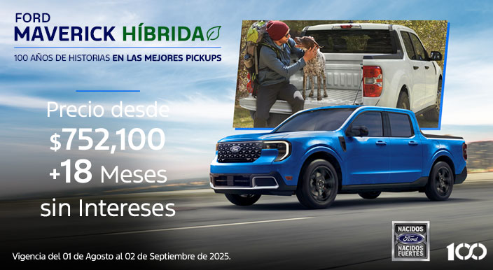 Maverick Híbrida 2025 Sujeto a análisis de crédito por parte de Ford Credit de México, S.A. de C.V., SOFOM, E.R. Precio desde $752,100.00 (SETECIENTOS CINCUENTA Y DOS MIL CIEN PESOS 00/100 M.N. IVA INCLUIDO) para Ford Maverick 2025 catálogo XLT Híbrida. Plan de financiamiento 24/16.20% (VEINTICUATRO MESES AL DIECISEIS PUNTO VEINTE POR CIENTO DE TASA DE INTÉRES ANUAL ORDINARIA FIJA) calculado al 24/07/2025 con una tasa de interés anual ordinaria fija del 16.20% (DIECISEIS PUNTO VEINTE POR CIENTO) sobre un plazo de 24 (VEINTICUATRO) meses. Aplica comisión por apertura de crédito. Los intereses se generarán a partir de la firma del contrato respectivo de financiamiento con Ford Credit de México, S.A. de C.V., SOFOM, E.R. Sujeto a disponibilidad de crédito. No aplica para flotillas. Consulta términos y condiciones en tu Distribuidor autorizado Ford más cercano. Ford Motor Company, S.A. de C.V., todos los derechos reservados. Imágenes meramente ilustrativas. Vigencia del 01 de agosto al 02 de septiembre del 2025. Plan de financiamiento 18/0% (DIECIOCHO MESES AL CERO POR CIENTO DE TASA DE INTERÉS ANUAL ORDINARIA FIJA) aplica con un desde $752,100.00 (SETECIENTOS CINCUENTA Y DOS MIL CIEN PESOS 00/100 M.N. IVA INCLUIDO) para Ford Maverick 2025 catálogo XLT Híbrida CAT PROMEDIO 21.81% (VEINTIUNO PUNTO OCHENTA Y UNO POR CIENTO) sin IVA para fines informativos y de comparación calculado al 24/07/2025 con una tasa de interés anual ordinario fija del 0% (CERO POR CIENTO) sobre un plazo de 18 (DIECIOCHO) meses, aplica con un enganche mínimo del 40% (CUARENTA POR CIENTO), aplica con prima de seguro de daños y vida de contado por todo el plazo. Aplica comisión por apertura de crédito. Los intereses se generarán a partir de la firma del contrato respectivo de financiamiento con Ford Credit de México, S.A. de C.V., SOFOM, E.R. Sujeto a disponibilidad. No aplica para flotillas. Consulta términos y condiciones en tu Distribuidor autorizado Ford más cercano. Ford Motor Company, S.A. de C.V., todos los derechos reservados. Imágenes meramente ilustrativas. Vigencia del 01 de agosto al 02 de septiembre del 2025. Seguro para Ford Maverick 2025 con precio preferencial único para el primer año de $25,400 (VEINTICINCO MIL CUATROCIENTOS PESOS 00/100 M.N. IVA INCLUIDO) PRIMA TOTAL. Aplica con la contratación y pagos anuales de la póliza Ford Insure en operaciones de crédito. El seguro tendrá una prima total sin costo para el primer año o primer recibo de 12 (DOCE) meses y los recibos subsecuentes se emitirán por el precio regular. Ford Insure es un programa de seguros en conjunto con Zurich Compañía de Seguro, S.A. Sujeto a disponibilidad. Vigencia del 01 de agosto al 02 de septiembre del 2025.