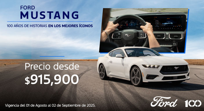 Mustang 2025 Sujeto a análisis de crédito por parte de Ford Credit de México, S.A. de C.V., SOFOM, E.R. Precio desde $915,900.00 (NOVECIENTOS QUINCE MIL NOVECIENTOS PESOS 00/100 M.N. IVA INCLUIDO) para Ford Mustang 2025 catálogo EcoBoost. Plan de financiamiento 24/16.20% (VEINTICUATRO MESES AL DIECISEIS PUNTO VEINTE POR CIENTO DE TASA DE INTÉRES ANUAL ORDINARIA FIJA). CAT 64.6% (SESENTA Y CUATRO PUNTO SEIS POR CIENTO) calculado al 30/07/2025 con una tasa de interés anual ordinaria fija del 16.20% (DIECISEIS PUNTO VEINTE POR CIENTO) sobre un plazo de 24 (VEINTICUATRO) meses, aplica con un enganche mínimo del 10% (DIEZ POR CIENTO). Aplica con prima de seguro de daños y vida de contado por todo el plazo. Aplica comisión por apertura de crédito. Los intereses se generarán a partir de la firma del contrato respectivo de financiamiento con Ford Credit de México, S.A. de C.V., SOFOM, E.R. Sujeto a disponibilidad de crédito. No aplica para flotillas. Consulta términos y condiciones en tu Distribuidor autorizado Ford más cercano. Ford Motor Company, S.A. de C.V., todos los derechos reservados. Imágenes meramente ilustrativas. Vigencia del 01 de agosto al 02 de septiembre del 2025.